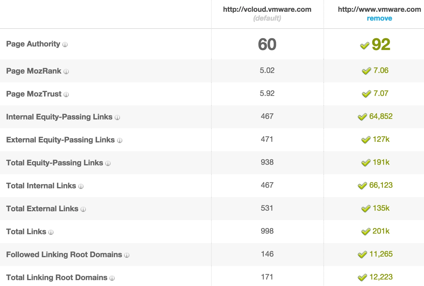The bigger problem? The newly established subdomain destination (known as the vCloud Air microsite or simply the microsite moving forward) was competing against a domain (vmware.com) with over 135k inbound links and a domain authority score of 93.