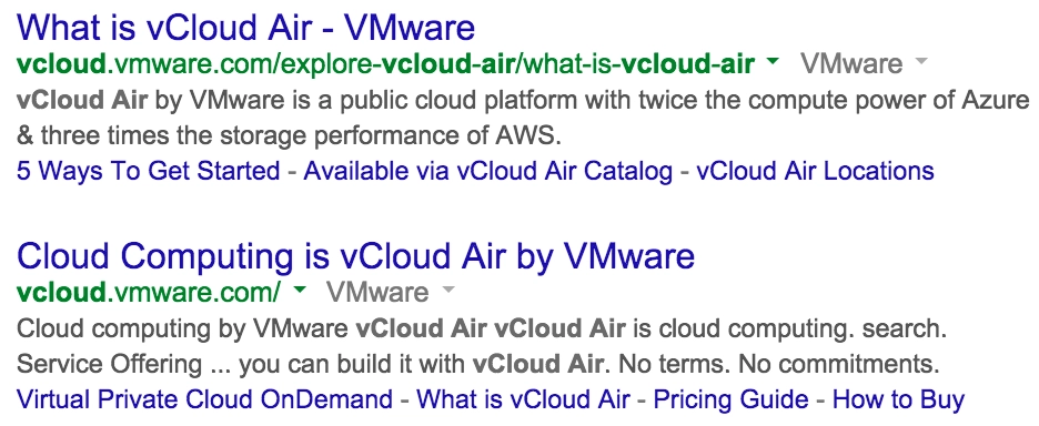 Search for "vCloud Air" yourself: we have a #1 and a #2 result, both with organic site links: